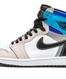 The Air Jordan 1 High OG ‘Prototype’ is a September 2021 release of the vintage basketball shoe by Jordan Brand in a colorway with a pre-production design ethos. Inspired by actual prototypes. the aptly named ‘Prototype’ makeup of Michael Jordan’s first signature shoe is complete with various contrasting panels and accenting hues. The upper features a white leather base with contrasting beige panels on the toe cap. forefoot. and eyelets. Both the Swoosh logo and heel appear in black leather. The collar and ankle flap are constructed in two hues of blue leather and synthetic nubuck. respectively. Reflective silver detailing is also added to the hel between the blue panels and the black heel panel. To further articulate the prototype look. perforations on the collar mark where you can cut to make the high-top shoe into a low-top. Release date: September 24. 2021