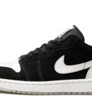 The Air Jordan 1 Low ‘Diamond’ is a February 2022 release of the low-top retro basketball shoe in a colorway inspired by Air Jordan diamond basketball shorts. Versatile in a black-and-white color block. the ‘Diamond’ features black synthetic nubuck on the toe cap. forefoot. eyelets. mid-panel. and collar. The perforated toe. Swoosh. and heel are designed in white leather. A black ‘Wings’ logo is embroidered on the back of the shoe. The unique ‘diamond’ logo found on the tongue tag mimics the design of the same detailing found on the sides of Jordan Brand’s mesh basketball shorts. which are inspired by classic Chicago Bulls shorts. A white rubber midsole and milky translucent outsole completes the look.