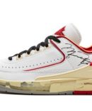 The Off-White x Air Jordan 2 Low OG ‘Chicago’ is a collaboration between Virgil Abloh’s high fashion and streetwear brand and Jordan Brand on a vintage-inspired colorway of Michael Jordan’s second signature shoe. Off-White’s Air Jordan 2 Low honors the classic retro basketball shoe’s 35-year anniversary by reimagining the model’s original ‘Chicago’ colorway in the brand’s popular ‘new-vintage’ aesthetic. Modifications to the design of the Air Jordan 2 Low by Off-White include a pre-yellowed. pre-‘cracked’ midsole that replicates the look of crumbled soles associated with original 1987 pairs of the Jordan 2. The upper is constructed from white tumbled leather. Industrial-style Off-White branding is stamped onto the medial side of the shoe. Michael Jordan’s signature appears on the collar of the lateral side. Red ‘Wings’ branding resides on the white leather tongue and Off-White’s signature ‘SHOELACES’ detailing can be found on the black laces. The exposed foam padding found on the collar is consistent with the styling of Off-White’s Air Jordan collaborations.