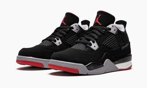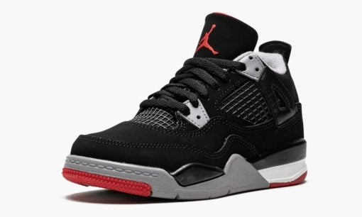 The Air Jordan 4 PS Bred is the preschool-sized version of the 2019 retro of the iconic Air Jordan. This little kids’ Bred Jordan 4 features the same classic look of the adult version. The Air Jordan is built with a black Durabuck (synthetic nubuck) upper with Cement Grey and Fire Red accents throughout. Every pair is complete with the original Nike branding on the heel. which has not been seen on the shoe since its 1999 retro. The Air Jordan 4 PS Bred released on May 4. 2019.