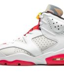 The Air Jordan 6 ‘Hare’ is a Spring 2020 release that features overtures to another classic Jordan shoe: the original Air Jordan 7 ‘Hare.’ Famously appearing on the feet of Bugs Bunny during the early ’90s television commercials with Michael Jordan. the ‘Hare’ Jordan theme returns with a modern twist as Jordan Brand honors the legacy of ‘The GOAT’s’ sneaker collection. White leather overlays contrast the light grey perforated synthetic nubuck base that appears on the mid-panel and toe. A red neoprene lace cover with a black Jumpman logo sits just below the clear rubber tongue that reveals the multicolor geometric pattern found on the Jordan 7’s tongue underneath. An orange and green lace lock that resembles a carrot adds the final special touch for the upper. while red translucent rubber highlights the sole. Release date: Spring 2020.