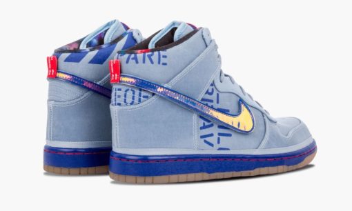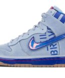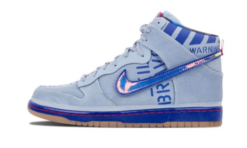 One of three special Dunk High colorways included in the ‘Galaxy’ collection by Nike for NBA All-Star weekend in 2012. this aerospace-inspired Dunk features a grey canvas upper with blue accents and iridescent Swooshes. Special details include removable velcro patches. the galaxy print on the inner lining. and clear outsoles.