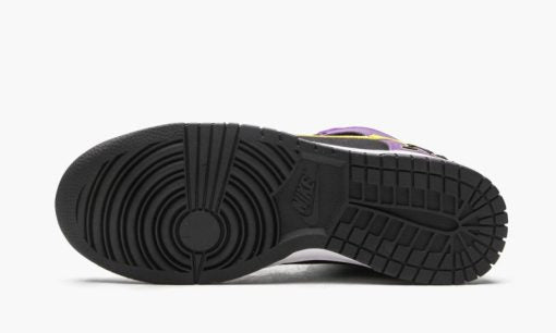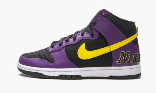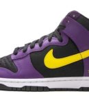 The Nike Dunk High ‘Lakers’ is a May 2021 release of the venerable lifestyle shoe that salutes the Los Angeles Lakers’ team uniforms. One of the more adventurous Dunk releases of 2021. the ‘Lakers’ honors the legendary basketball team by employing its uniform colors and branding into its design. The base of the shoe is constructed of a durable black canvas twill material. Contrasting purple leather overlays can be found on the forefoot. eyelets. collar. and heel. A vibrant Varsity Yellow leather Swoosh adorns either side and a Lakers-esque ‘Nike Air’ tongue tag can be found on the top of the black nylon tongue. The embossed ‘Nike’ embroidery appears in Lakers typography on the heel to complete the look. Release date: May 28. 2021.