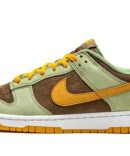 The Nike Dunk Low ‘Dusty Olive’ is a June 2021 release of the retro basketball and lifestyle shoe by Nike that references the brand’s Japan-exclusive ‘Ugly Duckling’ pack from the early 2000s. The ‘Dusty Olive’ is not an original colorway from the collection. but is instead a flip on the color block of the three pairs that appeared in the whimsically-named collection from the early aughts. The forefoot. eyelets. collar. and heel display a Dusty Olive suede construction. Contrasting chocolate brown suede appears on the perforated toe. mid-panel. collar. and heel. A Pro Gold suede Swoosh breaks up the look on both sides. The same yellow hue appears on the suede heel tab with green ‘Nike’ embroidery. on the laces. and on the classic ‘Nike’ and Swoosh branding on the brown nylon tongue tag on the brown nylon tongue. A two-tone white midsole and Pro Gold-colored rubber outsole complete the look. Release date: June 17. 2021