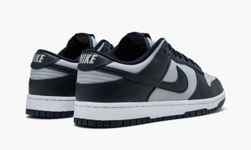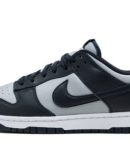 The Nike Dunk Low ‘Georgetown’ is an semi-original colorway of the retro basketball shoe from Nike’s college basketball-inspired ‘Be True to Your School’ collection of Dunks from 1985. We ay semi-original because the grey-and-navy color scheme originally appeared on the Nike Terminator from the same era as the original 1985 set of Dunks. For this ‘Georgetown’ Dunk Low. grey leather appears on the perforated toe. mid-panel. collar. and heel. The forefoot. eyelets. collar. heel. and Swoosh are dressed in Midnight Navy leather. Grey ‘Nike’ branding is embroidered on the back and printed on the navy blue tongue tag with a Swoosh logo. Finishing touches include Midnight Navy laces. a white rubber midsole. and a navy blue outsole. Release date: November 5. 2021