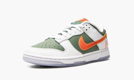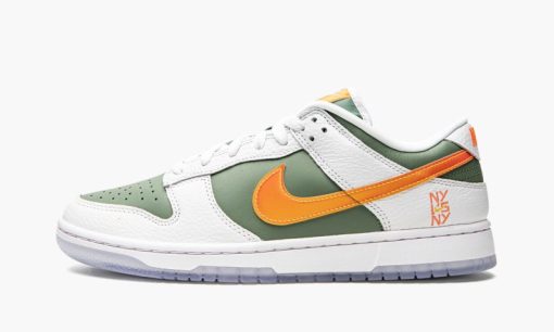 The Nike Dunk Low ‘NY vs NY’ is a special New York City edition for the retro basketball shoe that gives a nod to the city’s legendary streetball scene. A Summer 2021 release by Nike. the ‘NY vs NY’ is a mostly two-tone. white-and-green makeup of the popular silhouette that features unique detailing specific to various New York City streetball parks. White tumbled leather can be found on the forefoot. eyelets. collar. and heel. Contrasting green leather appears on the base of the shoe. specifically on the perforated toe. mid-panel. collar. and heel. Orange ‘NY vs NY’ branding is embroidered on the lateral side of the heel and a gradient red-and-orange leather Swoosh can be found on the mid-panel. Additional branding appears in the form of an orange embroidered ‘Nike’ logo on the heel and yellow and orange ‘Nike’ detailing on the tongue tag of the left and right shoe. respectively. The names of iconic New York City streetball parks like West 4th Street. Dyckman. and Gersch Park appear in graffiti-style text underneath the icy blue translucent outsole.