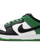 The Nike SB Dunk Low ‘Classic Green’ is a colorway of the low-top skate shoe that draws design inspiration from the Boston Celtics. In addition to referencing the storied basketball team’s uniform colors. the ‘Classic Green’s’ white. black. and green color block mimics the appearance of the Air Jordan 1’s original ‘Black Toe’ colorway. Specifically. the white leather perforated toe and contrasting black leather toe cap and forefoot replicate the look of the ‘Black Toe.’ As for the rest of the shoe. details include a black leather Swoosh. a Classic Green leather collar and heel. and green laces. Green ‘Nike SB’ and Swoosh detailing can be found on the black nylon tongue tag. Tonal ‘Nike’ branding is embroidered onto the heel. A two-tone. white rubber midsole and black outsole complete the clean look.