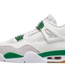 The Nike SB x Air Jordan 4 Retro ‘Pine Green’ presents a skate-ready version of the legacy silhouette. Crafted from smooth off-white leather. the upper is reinforced with a forefoot overlay in light grey suede. Contrasting green accents land on the molded eyelets and heel tab. the latter marked with embossed Nike SB branding. A crimson Jumpman on the Flight tongue tag provides an unexpected pop of color. The sneaker rides on a two-tone foam midsole. fitted with an exposed Air-sole unit in the heel and supported by a gum rubber outsole