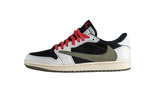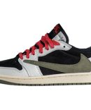 The Travis Scott x Women’s Air Jordan 1 Retro Low OG ‘Olive’ presents the chart-topping rapper’s first sneaker collaboration in female sizing. The upper combines a black suede base with off-white leather overlays and olive suede Swooshes. featuring a reverse check on the lateral side and a traditional design on the opposite side. The neutral earth tones are punctuated by bold crimson accents. highlighted by woven Nike Air tongue tags and mismatched Jordan and Cactus Jack branding on each heel tab. Anchoring the low-top is a rubber cupsole that pairs vintage off-white sidewalls with an olive green rubber outsole.