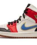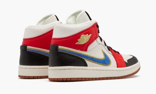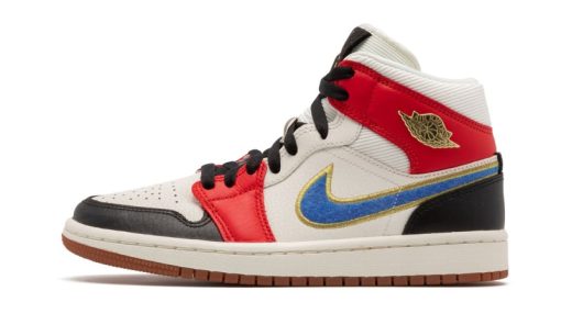 The Women’s Air Jordan 1 Mid SE ‘Let(Her)man’ is a women’s exclusive release of Michael Jordan’s first signature shoe in a colorway inspired by the Jordan Wings scholarship program. Moreover. the ‘Let(Her)man’ is a play on the word ‘letterman’ and its design is influenced by the varsity jackets worn across college campuses. Details include Sail leather on the perforated toe. mid-panel. and middle eyelet overlay. The same hue of cream is applied to the corduroy detailing on the collar and tongue. Both the toe cap and heel feature black leather overlays. Contrasting fiery Chile Red leather overlays can be found on the forefoot and collar. Branding appears in the form of a light blue felt Swoosh with gold outlining on the mid-panel and gold ‘Wings’ emblem on the collar. The same fuzzy material used on the side Swoosh appears on the black tongue tag with gold Jumpman detailing. A cream colored midsole provides an infusion of nostalgic vibes. Release date: November 20. 2020.