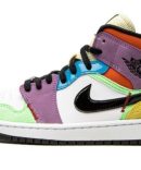 The Women’s Air Jordan 1 Mid ‘Lightbulb’ features a medley of washed out hues of color across Michael Jordan’s first signature shoe in mid-top height. Fitted in women’s sizing. this Jordan 1 Mid is a refreshing new design from Jordan Brand that displays an array of contrasting colors and materials for those who enjoy wearing eccentric shoes. The white leather base can be found on the perforated toe and mid-panel. Purple nubuck dots the forefoot and collar overlays. Mint suede appears on the toe and again on the quarter panel. Hairy mustard colored suede is located on the heel. Branding appears in the form of a black leather Swoosh on either side and black ‘Wings’ detailing on the collar. A bright orange synthetic material highlights the collar. University Blue accenting is located on the middle section of the eyelets. and a tan tongue with contrasting black cotton laces completes the look.