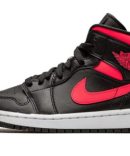 The Women’s Air Jordan 1 Mid ‘Siren Red’ is a women’s edition of Michael Jordan’s first signature shoe in a vibrant colorway. Appearing on the alternate Jordan 1 Mid silhouette. the ‘Siren Red’ is yet another exciting look for what is undoubtedly one of the most popular shoes in Jordan Brand’s line. The perforated toe. mid-panel. and heel are finished off in black leather. As are the adjoining overlay panels on the forefoot. eyelets. and collar. Siren Red ‘Wings’ branding can be found on the collar. The same attention grabbing shade of red is used on the Swoosh detailing on either side of the shoe. the collar. and on the Jumpman insignia on the black nylon tag stitched onto the tongue. Black shoelaces. a white rubber midsole. and black rubber outsole round out the look of the Women’s Air Jordan 1 Mid ‘Siren Red.’