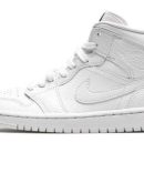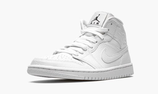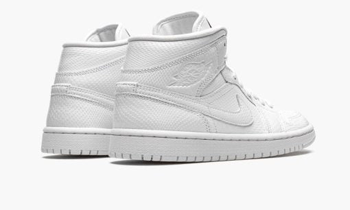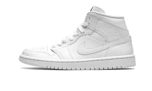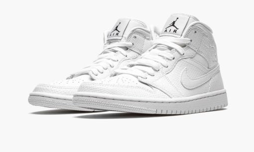 The Women’s Air Jordan 1 Mid ‘White Snakeskin’ is a women’s exclusive edition of Michael Jordan’s first signature shoe in a luxurious white monochromatic colorway. Versatile in every sense of the word. the ‘White Snakeskin’ is dressed in an all-over white leather faux snakeskin construction. The Swoosh and ‘Wings’ branding on the mid-panel and collar. respectively. feature the upscale design. as well. Additional details include black Jumpman and ‘Air’ branding on the white nylon tongue tag. a white nylon tongue. and white shoelaces. The crisp all-white-everything vibe continues underfoot with a white rubber midsole and outsole.
