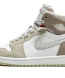 The Women’s Air Jordan 1 High Zoom CMFT ‘Olive Aura’ is a women’s-exclusive colorway of the alternate. modernized version of the retro basketball shoe that includes even more padding than the standard edition. The Zoom Comfort version of the Air Jordan 1 displays a deconstructed look similar to the Off-White x Air Jordan 1 from ‘The 10’ collection from 2017. The upper is constructed with a white leather base with grey hairy suede panels on the toe cap. forefoot. and eyelets. Olive nubuck is found on the heel and collar and a marbled grey Swoosh appears on both sides. A white wings logo can be found on the collar. On the tongue. ‘Zoom Air’ branding replaces the standard ‘Nike Air’ detailing found on the original Air Jordan 1. The modified branding symbolizes the Zoom Air cushioning utilized within the midsole.