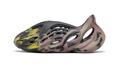 The adidas Yeezy Foam Runner ‘MX Carbon’ updates the futuristic clog with a colorful blended palette. Made with lightweight yet durable EVA foam. the molded one-piece build is finished in a swirling mix of black. grey. yellow. and pink. Ventilation ports of varying shapes and sizes provide airflow throughout the vamp and midfoot. while the sculpted collar and heel offer a secure fit. Exterior branding is limited to a discreet adidas logo on the outsole.